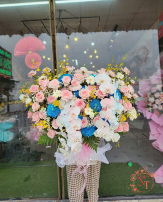 Các mẫu kệ hoa khai trương tại shop được thiết kế sang trọng, tông màu rực rỡ như đỏ, vàng, cam – tượng trưng cho tài lộc và thịnh vượng.